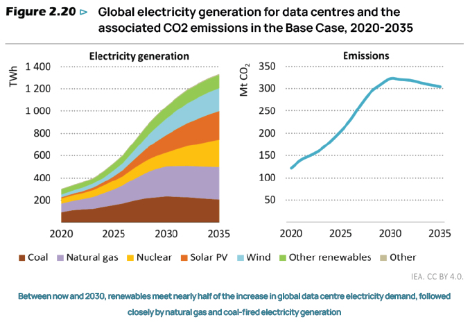 There’s concern that AI’s huge electricity consumption could worsen climate change. In the IEA’s base scenario, data center emissions will grow from 220 million tonnes (Mt) in 2024 to 300-320 Mt by 2035.